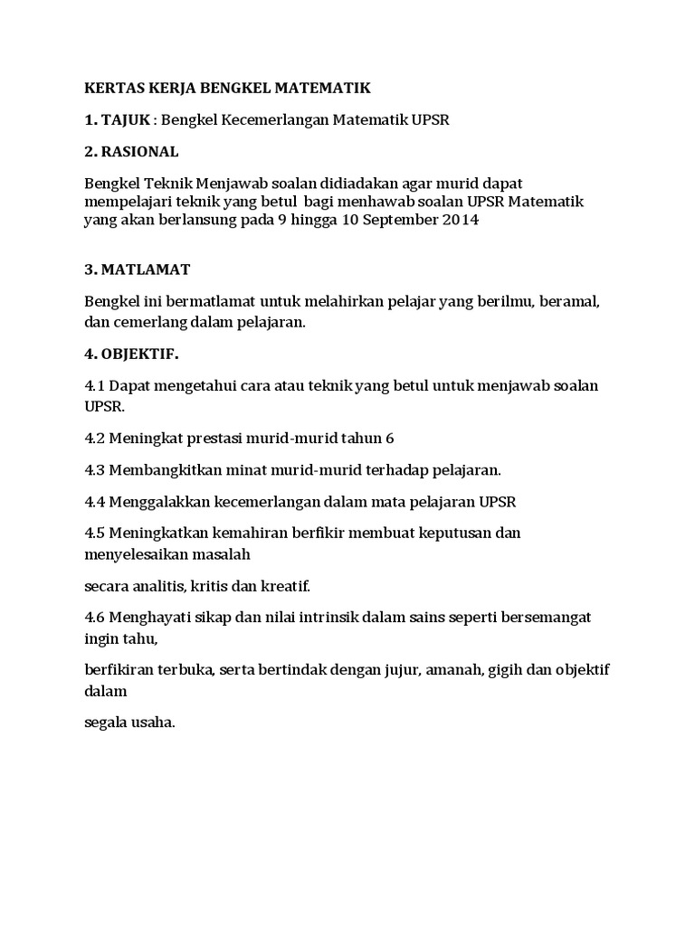 Contoh Kertas Kerja Bengkel Matematik Upsr